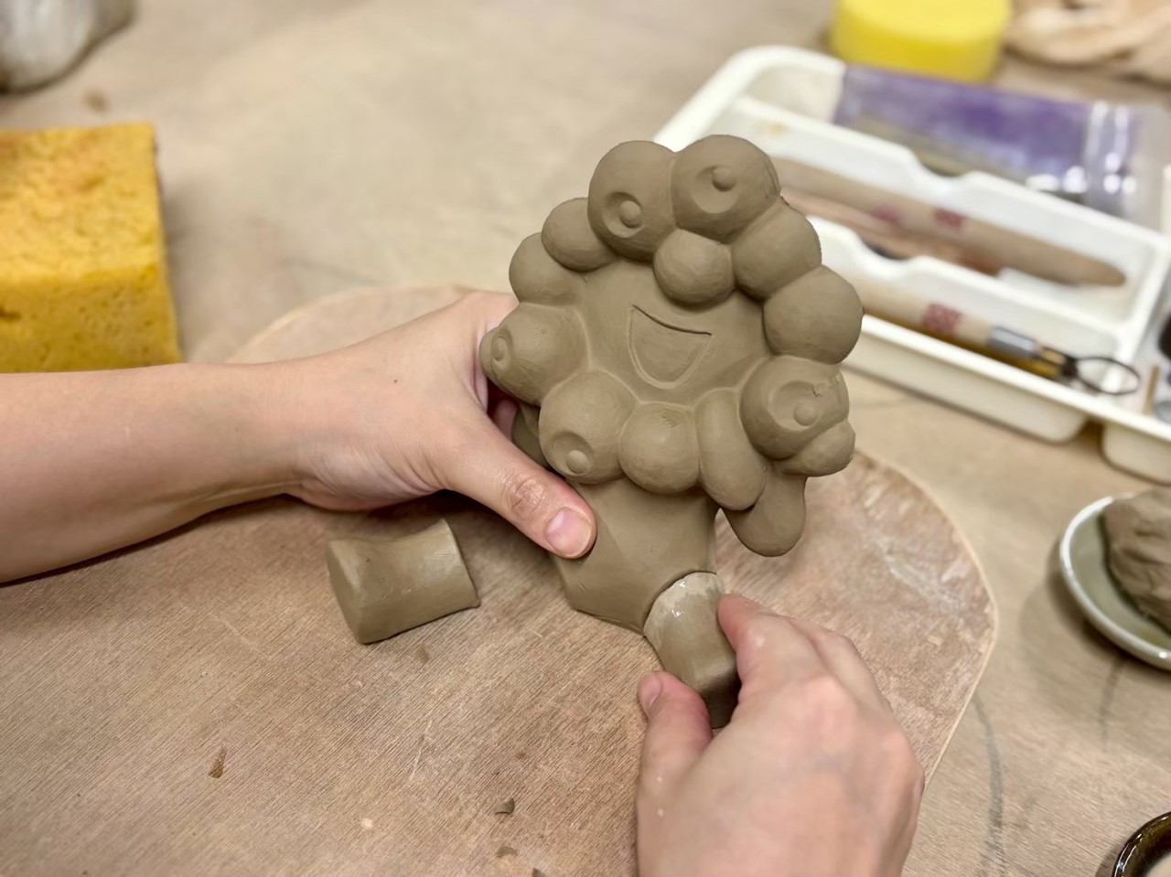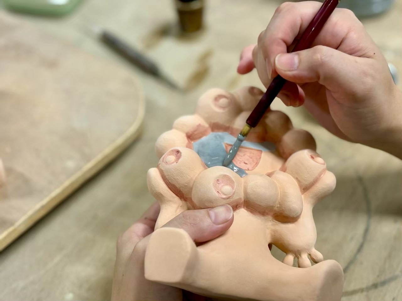 製作を担ったのは、育陶園の女性造形職人ひとり。原型づくりから複製用の型の製作まで、すべてを彼女の手で行いました。その型で成形した本体に、一つひとつ筆で釉薬を落としながら彩色を施し、沖縄の青い空と海を思わせる透明感のあるブルーと、伝統技法「赤絵」による鮮やかな赤を重ねました。三度の窯焼きを経て、やちむんらしい風合いと存在感を備えた「ミャクミャクやちむん」が完成しました。