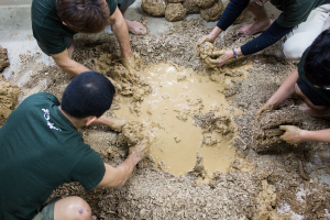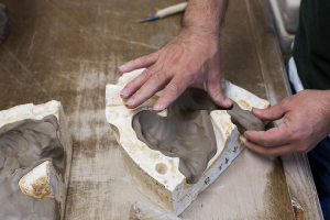 育陶園オリジナルの型に手押しで土を入れます。顔や筋肉の凹凸を考慮し土の厚みを均一にするのが非常に難しい作業で、土が厚すぎても薄すぎても、時間をかけすぎてもヒビが入るため、集中して土をはめます。