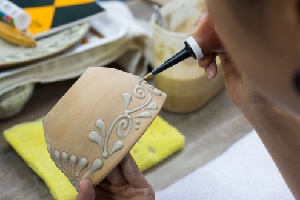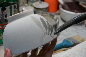 線彫:焼成前、化粧や釉薬が丁度良い乾燥状態になったら、下絵無しで迷いなく描いていきます。特に”唐草線彫”は10年以上のベテラン職人のみ仕上げることが出来る非常に難しいラインです。線彫を得意とする育陶園では、早く、美しく、伸びやかな線を先輩職人のサポートをしながら実践で、体で覚えていきます。